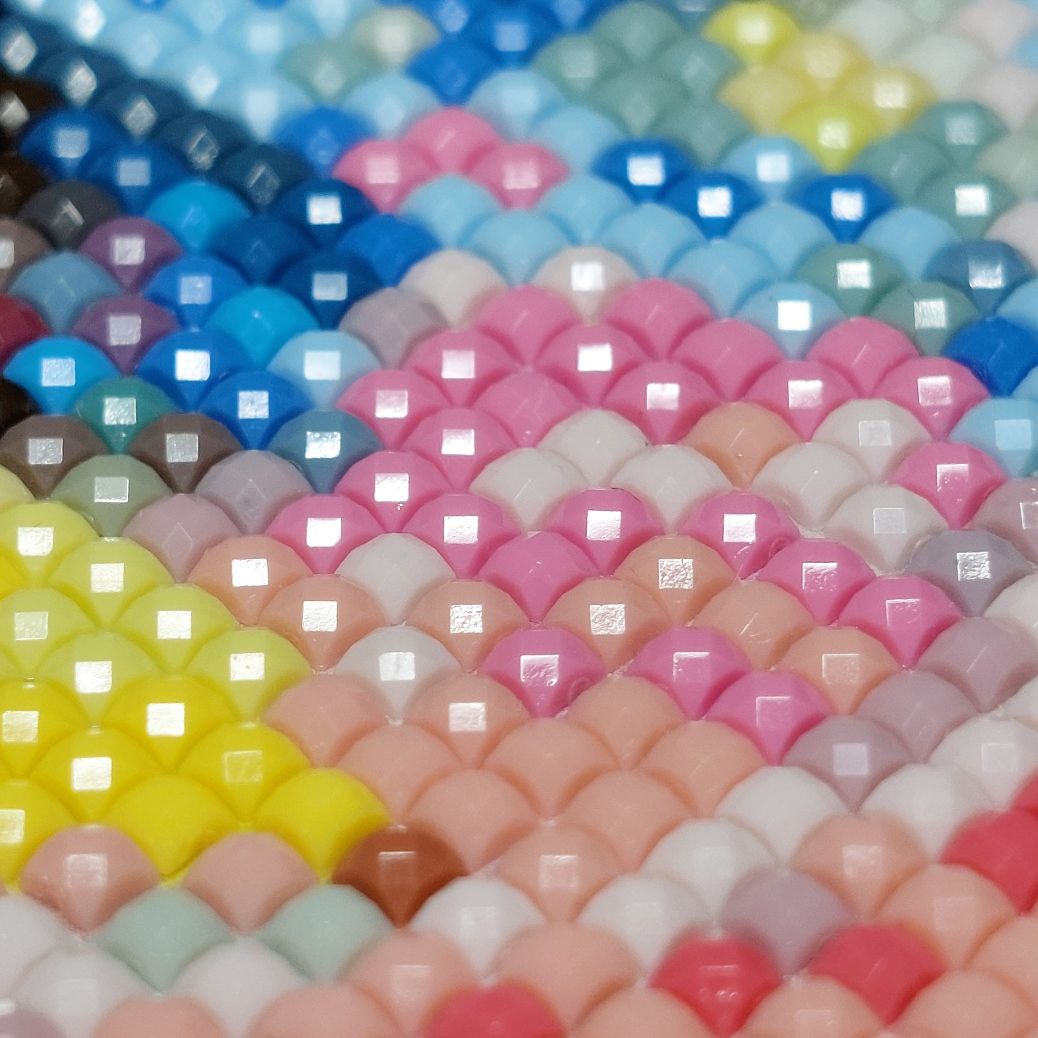 ビーズの種類はアクリル製スクエアビーズになります。静電気は起きにくいので扱いやすいことが特量です。樹脂製に比べて若干ビーズが小さいので、ピンセットなどを使って均等にすき間を開けながら丁寧にビーズを並べることでキレイな仕上がりになります。
