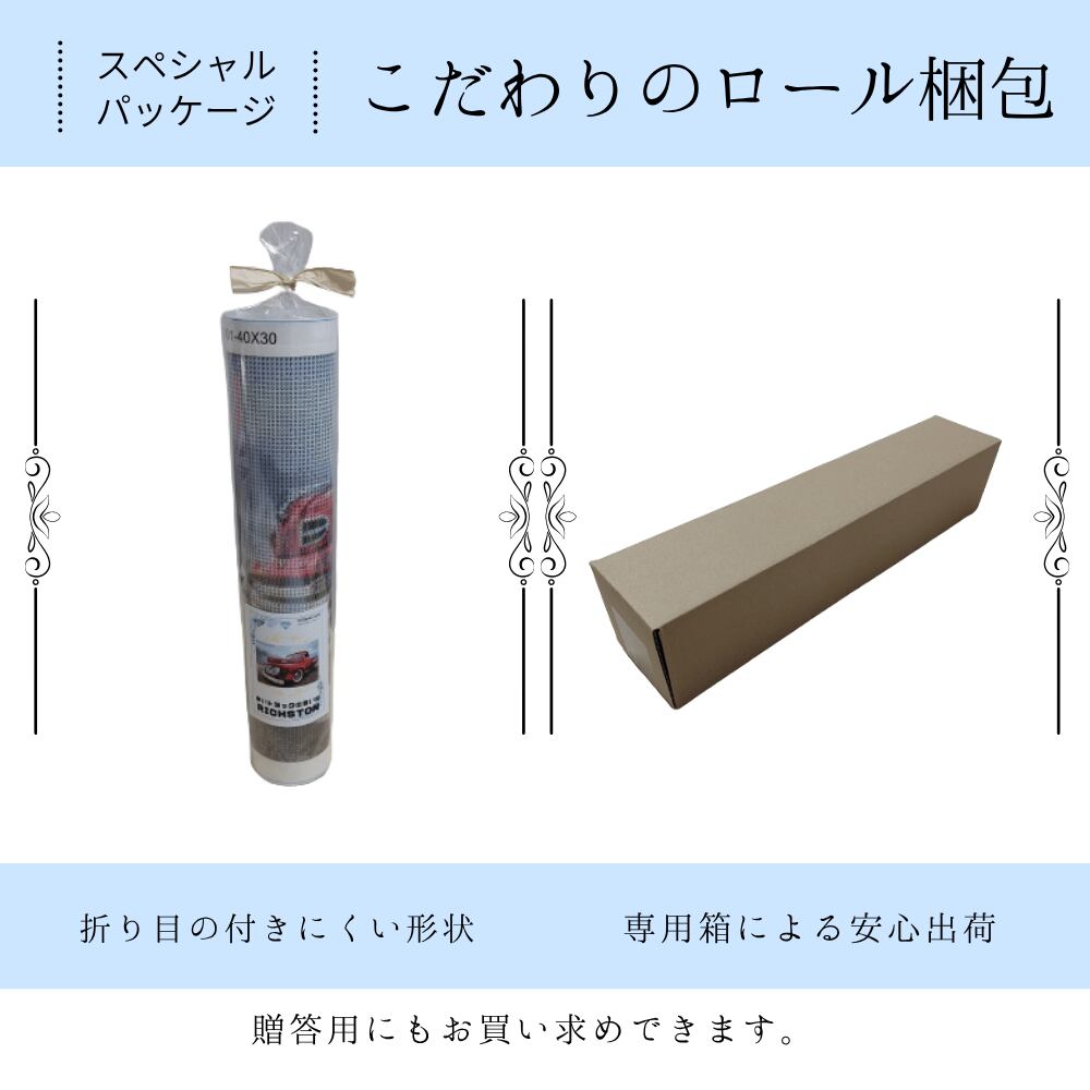 折り目のないロール梱包とコストを下げた六つ折りクリックポスト発送をオプションで選ぶことができます。必要な道具がキットとして入っていますので、商品の到着後すぐに作品に取り組むことができます。