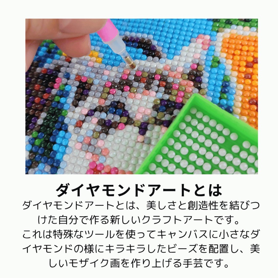 ダイヤモンドアートとは、美しさと創造性を結びつけた自分で作る新しいクラフトアートです。特殊なツールを使ってキャンバスに小さなダイヤモンド状のビーズを配置し、美しいモザイク画を作り上げる技法です。ビーズはダイヤモンドのようにキラキラと輝き、完成した作品は立体感があり、まるで宝石のように美しく輝きます。手軽に始めることができ、完成したときの達成感は格別です。自分だけの世界に没頭して、美しいアート作品を創造しましょう。