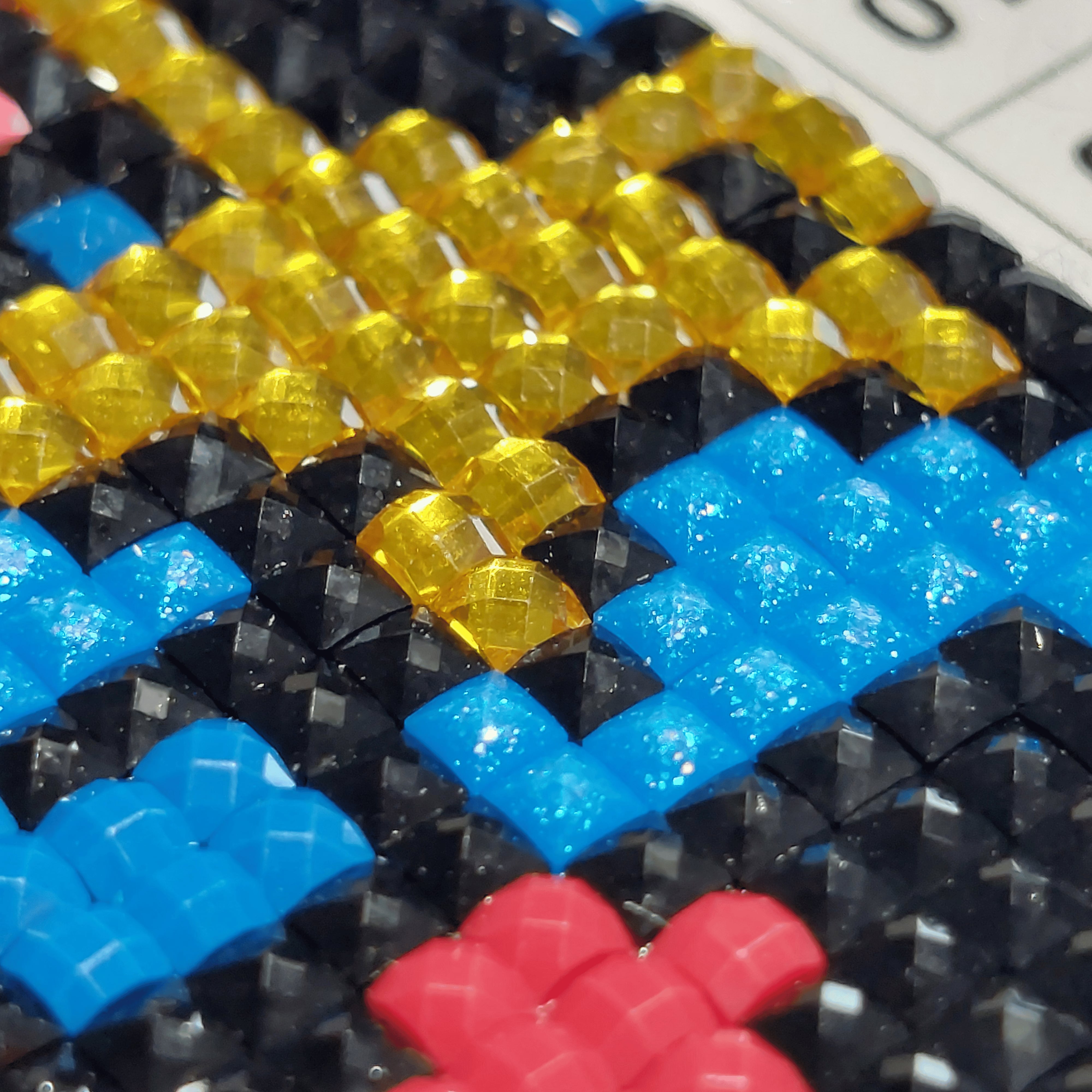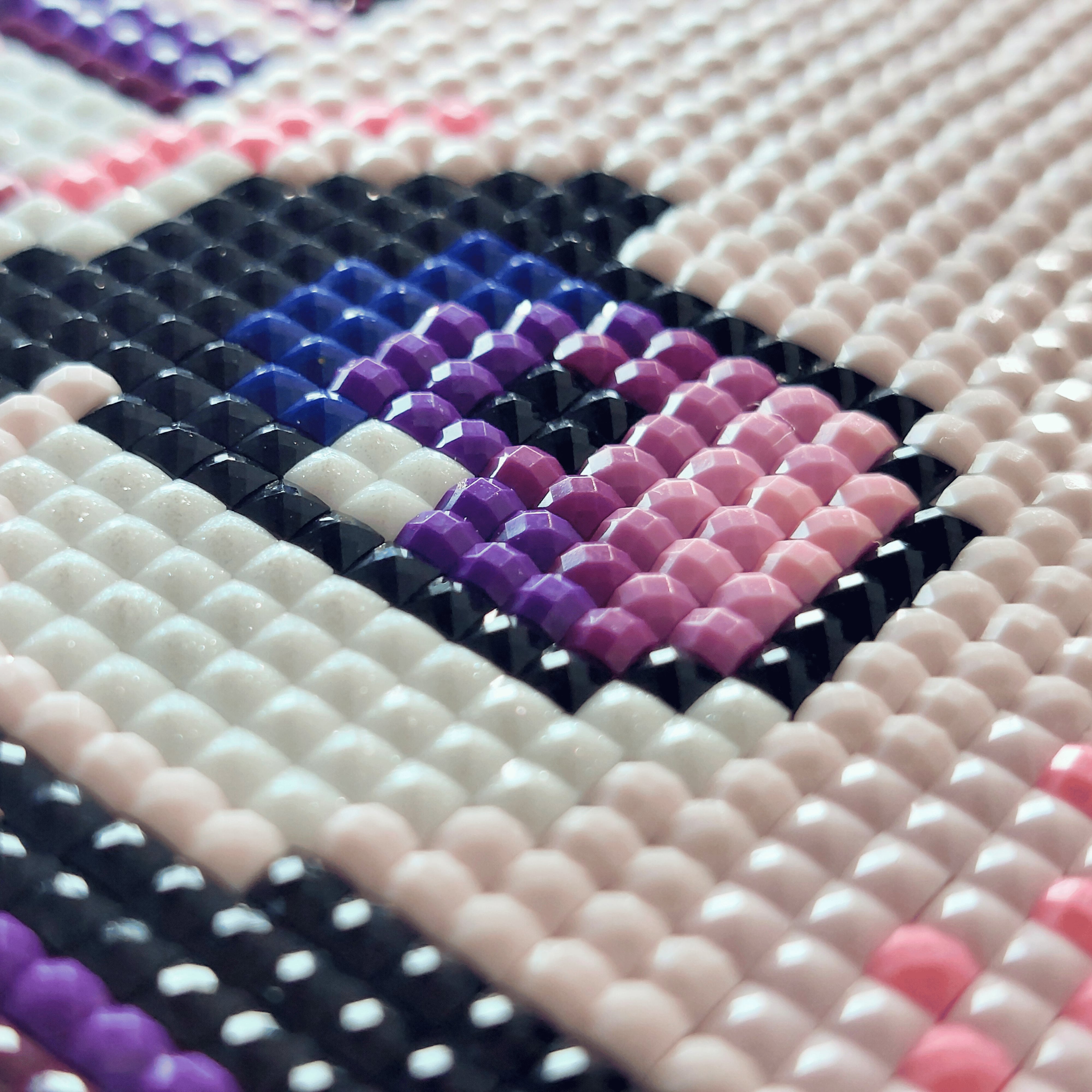 スクエアビーズは正方形の形状をしており、キャンバスを隙間なく埋めていく感覚が魅力です。仕上がりは緻密でモザイク画のように美しく、直線的なデザインや細部をしっかり表現したい作品に向いています。新工場では金型を改良し、暗色系を含めたビーズの精度を大きく向上させたため、均一で整った仕上がりを安心して楽しんでいただけます。